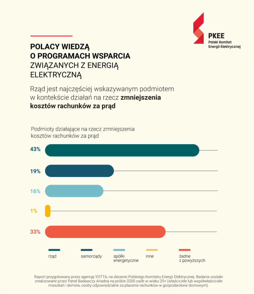Spytani o podmiot, który podejmuje najwięcej działań nakierowanych na zmniejszenie rachunków za prąd, ankietowani najczęściej wskazują na rząd. Takiej odpowiedzi udzieliło 43 proc. ankietowanych. 20 proc. uważa, że w ograniczeniu kosztów energii elektrycznej najwięcej robią samorządy, a 16 proc. doceniło na tym polu zasługi spółek energetycznych.